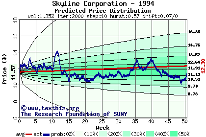 The high to date and low to date prices of the stock plotted against a random walk model for 1994 (what's this?).