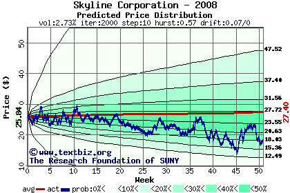 The high to date and low to date prices of the stock plotted against a random walk model for 2008 (what's this?).