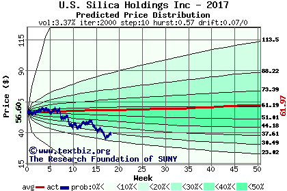 The high to date and low to date prices of the stock plotted against a random walk model for 2017 (what's this?).