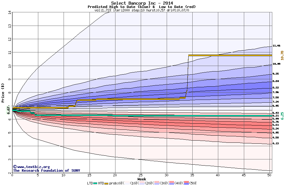 The high to date and low to date prices of the stock plotted against a random walk model for 2014 (what's this?).