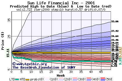 The high to date and low to date prices of the stock plotted against a random walk model for 2001 (what's this?).