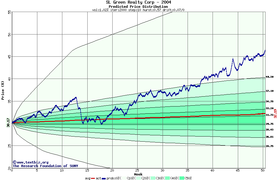 The following graph plots the year-to-date performance of the stock for 2004 compared to the probability calculated by a random walk model.