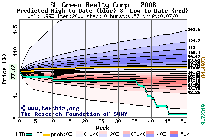 The high to date and low to date prices of the stock plotted against a random walk model for 2008 (what's this?).