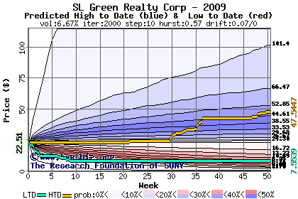 The high to date and low to date prices of the stock plotted against a random walk model for 2009 (what's this?).