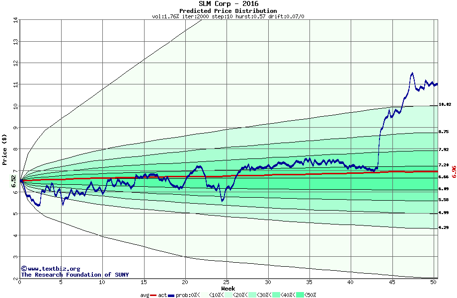 The following graph plots the year-to-date performance of the stock for 2016 compared to the probability calculated by a random walk model.