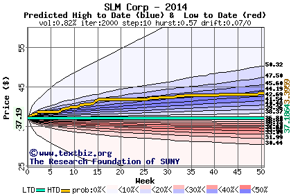 The high to date and low to date prices of the stock plotted against a random walk model for 2014 (what's this?).