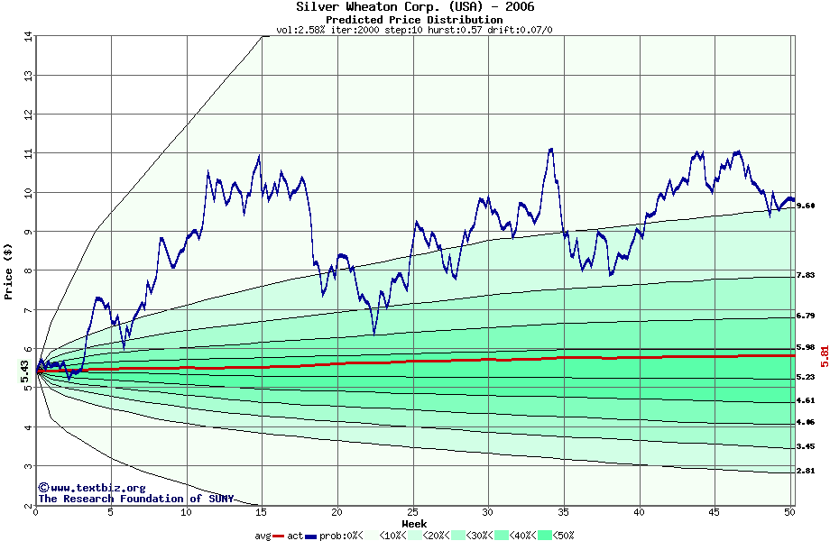 The following graph plots the year-to-date performance of the stock for 2006 compared to the probability calculated by a random walk model.