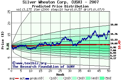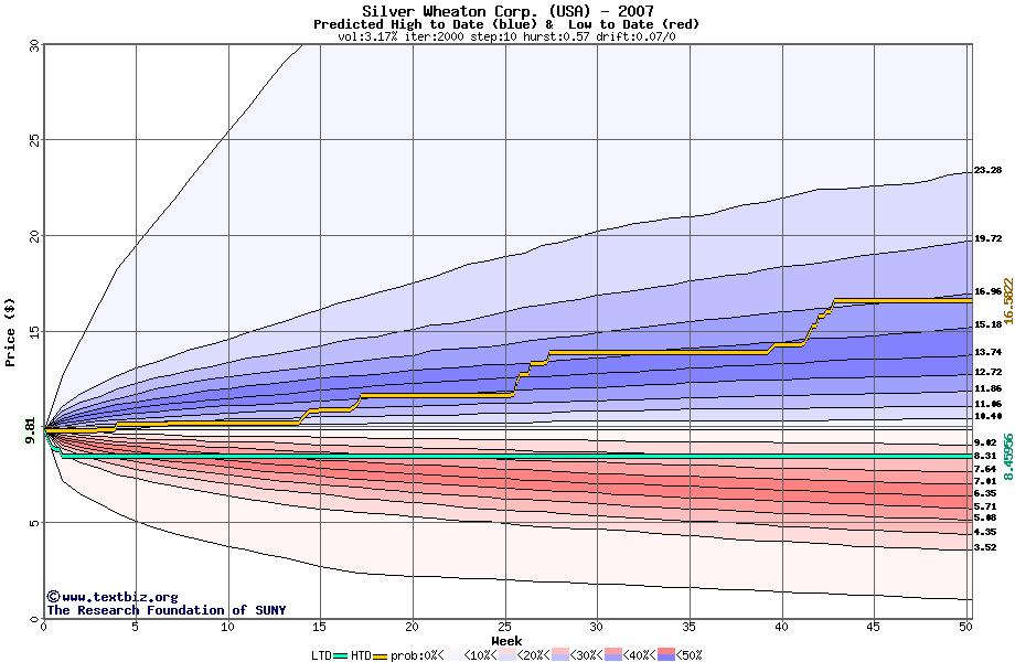 The high to date and low to date prices of the stock plotted against a random walk model for 2007 (what's this?).