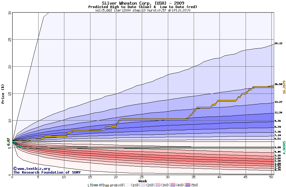 The high to date and low to date prices of the stock plotted against a random walk model for 2009 (what's this?).