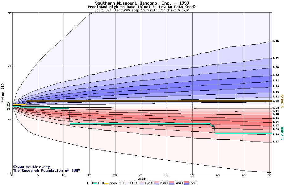 The high to date and low to date prices of the stock plotted against a random walk model for 1999 (what's this?).