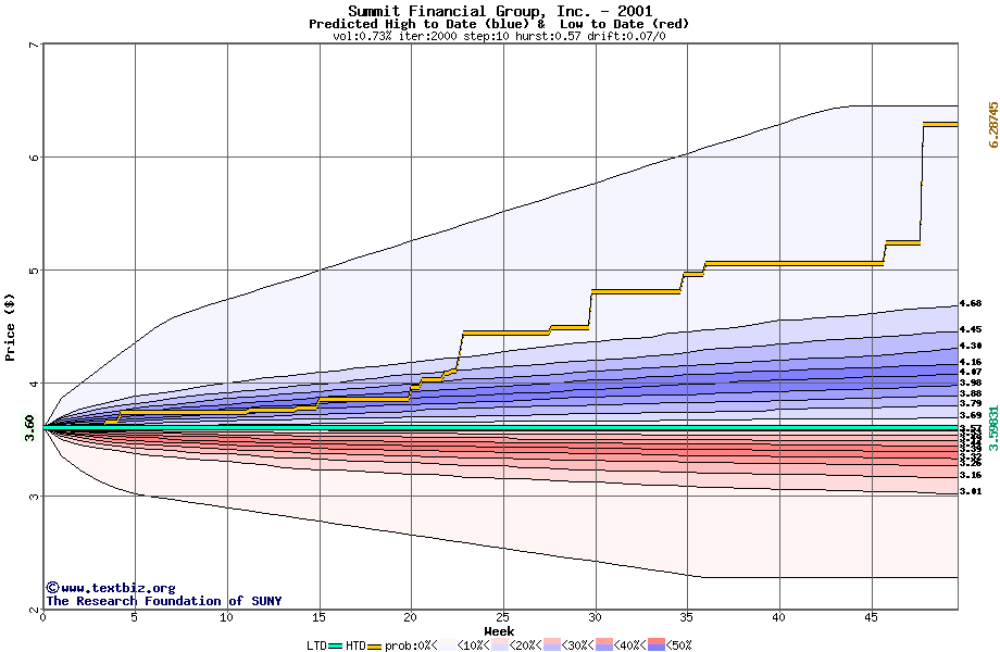 The high to date and low to date prices of the stock plotted against a random walk model for 2001 (what's this?).