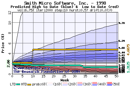 The high to date and low to date prices of the stock plotted against a random walk model for 1998 (what's this?).
