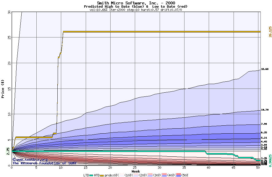 The high to date and low to date prices of the stock plotted against a random walk model for 2000 (what's this?).