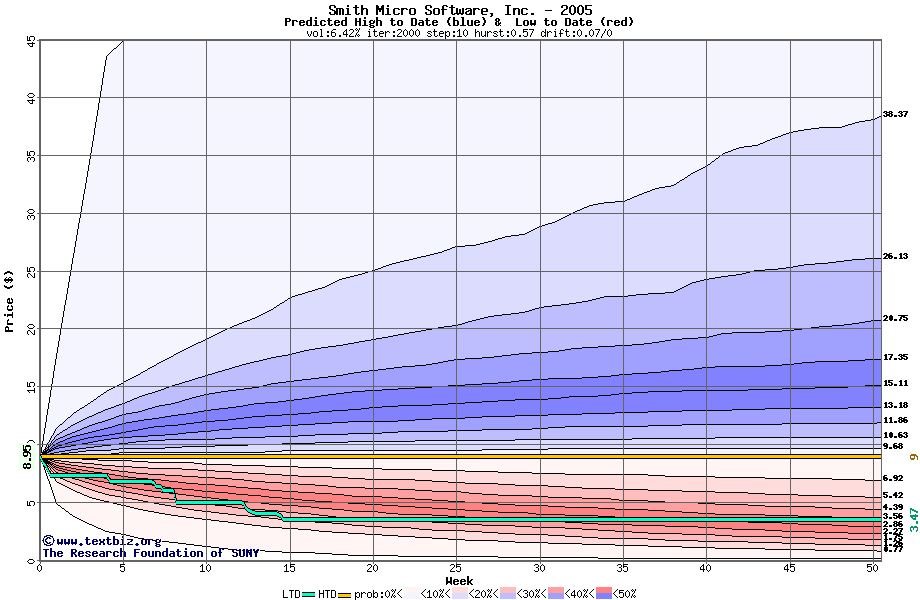 The high to date and low to date prices of the stock plotted against a random walk model for 2005 (what's this?).