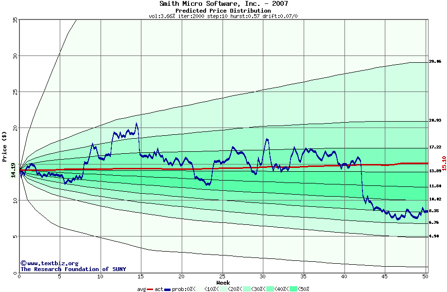 The following graph plots the year-to-date performance of the stock for 2007 compared to the probability calculated by a random walk model.