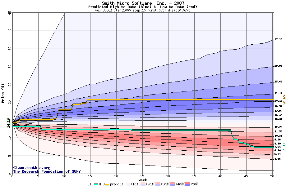 The high to date and low to date prices of the stock plotted against a random walk model for 2007 (what's this?).