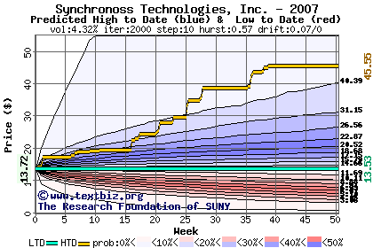 The high to date and low to date prices of the stock plotted against a random walk model for 2007 (what's this?).
