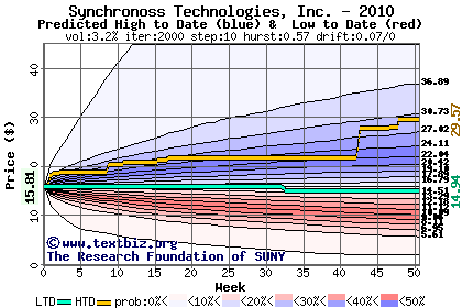 The high to date and low to date prices of the stock plotted against a random walk model for 2010 (what's this?).