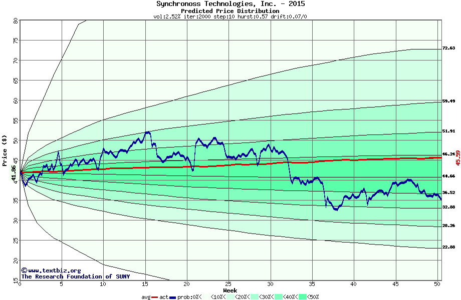 The following graph plots the year-to-date performance of the stock for 2015 compared to the probability calculated by a random walk model.