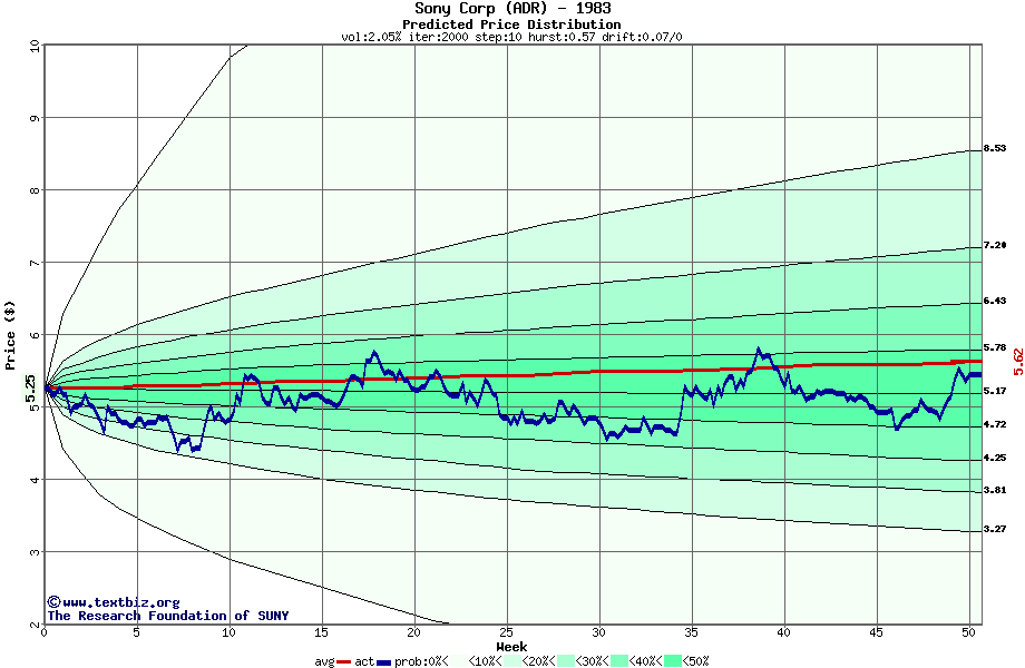 The following graph plots the year-to-date performance of the stock for 1983 compared to the probability calculated by a random walk model.