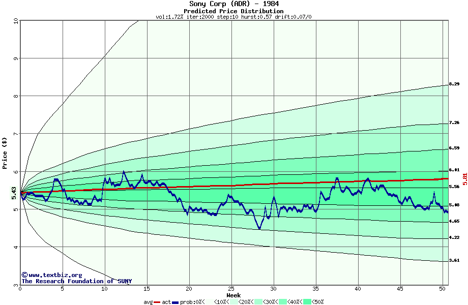 The following graph plots the year-to-date performance of the stock for 1984 compared to the probability calculated by a random walk model.