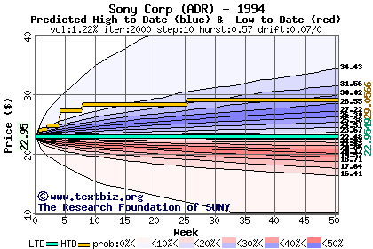 The high to date and low to date prices of the stock plotted against a random walk model for 1994 (what's this?).
