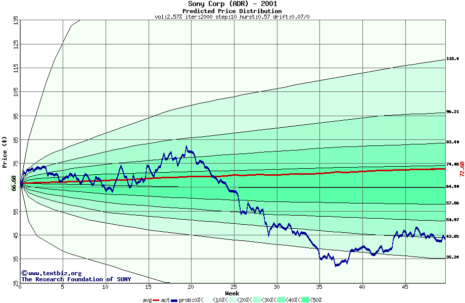 The following graph plots the year-to-date performance of the stock for 2001 compared to the probability calculated by a random walk model.