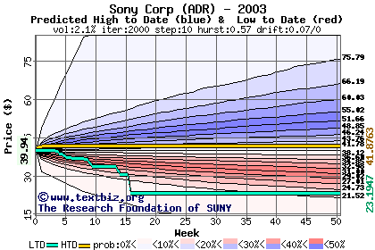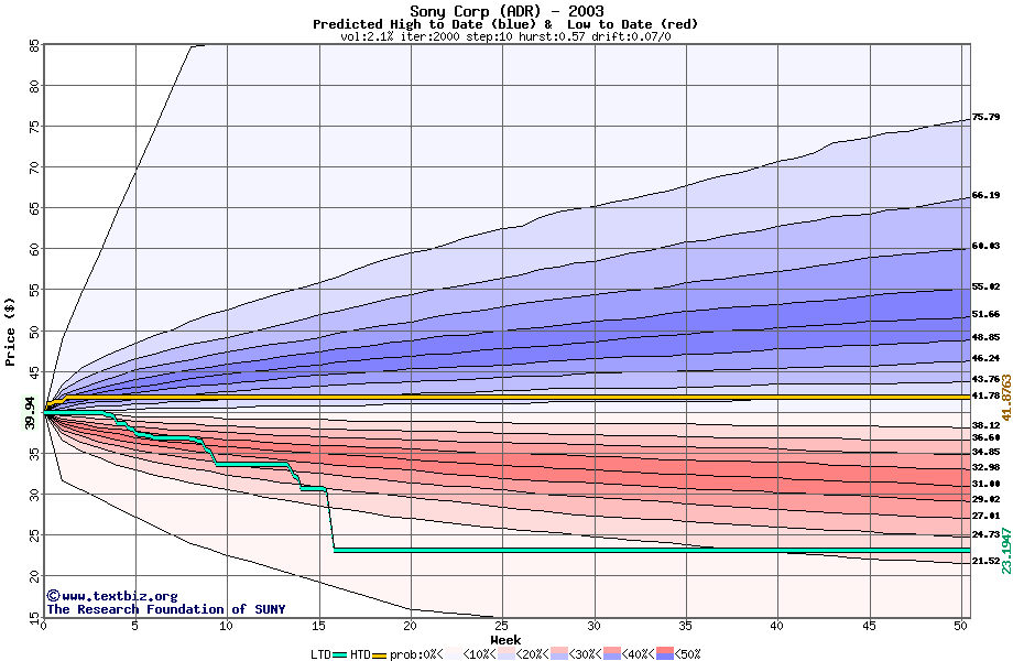 The high to date and low to date prices of the stock plotted against a random walk model for 2003 (what's this?).