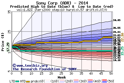 The high to date and low to date prices of the stock plotted against a random walk model for 2014 (what's this?).