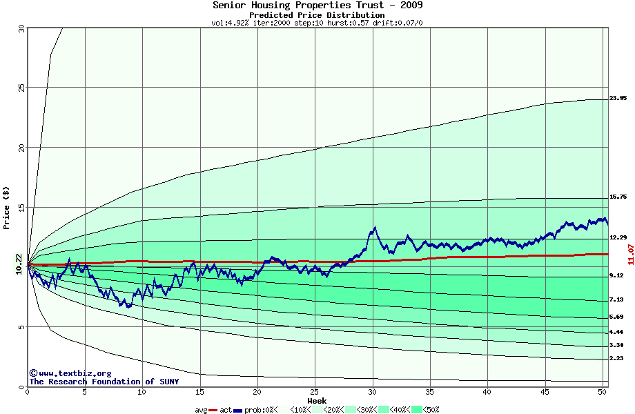 The following graph plots the year-to-date performance of the stock for 2009 compared to the probability calculated by a random walk model.