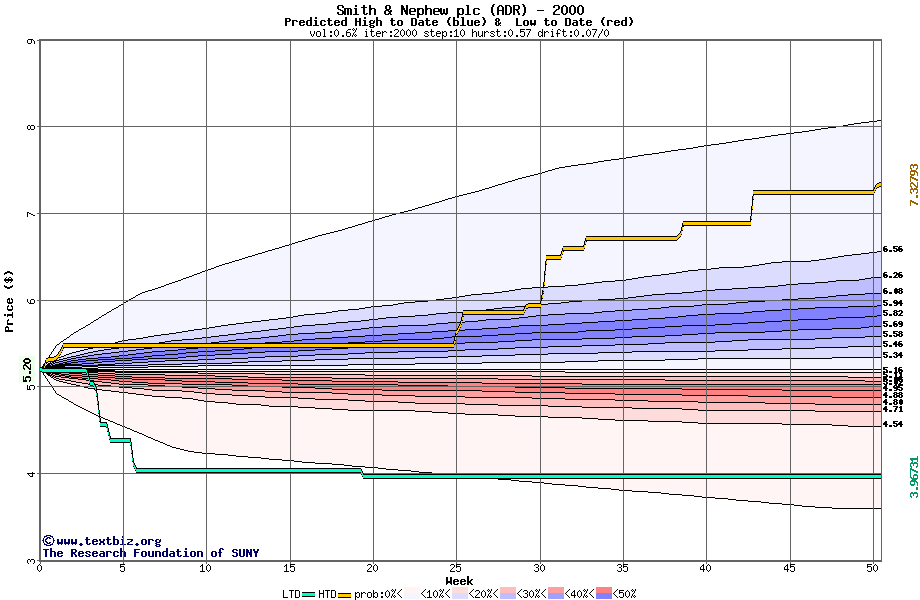 The high to date and low to date prices of the stock plotted against a random walk model for 2000 (what's this?).