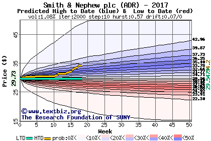 The high to date and low to date prices of the stock plotted against a random walk model for 2017 (what's this?).