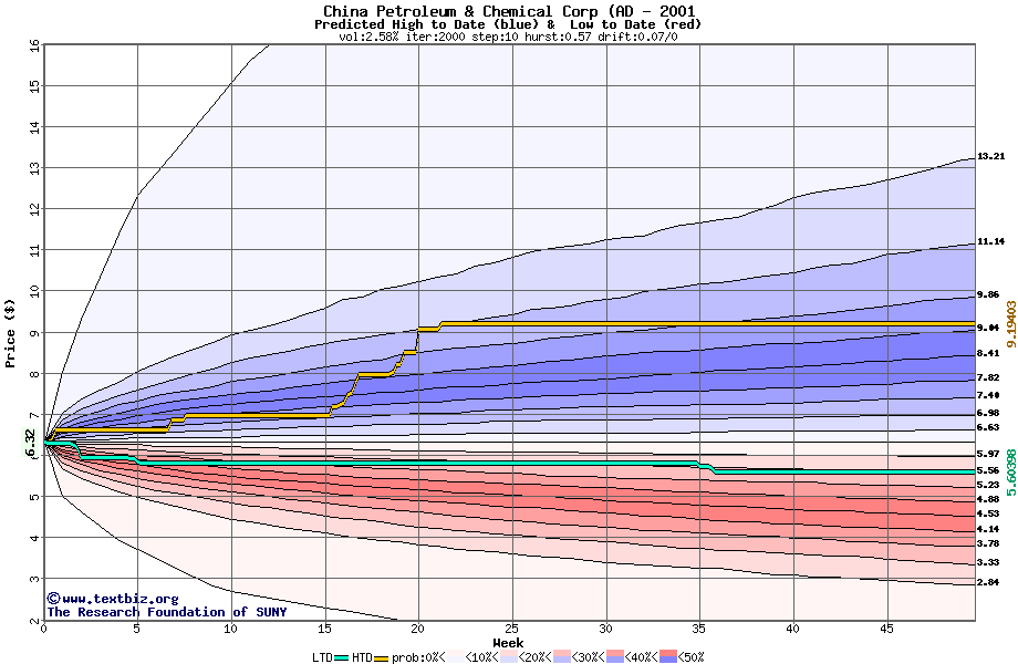 The high to date and low to date prices of the stock plotted against a random walk model for 2001 (what's this?).