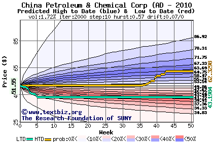 The high to date and low to date prices of the stock plotted against a random walk model for 2010 (what's this?).