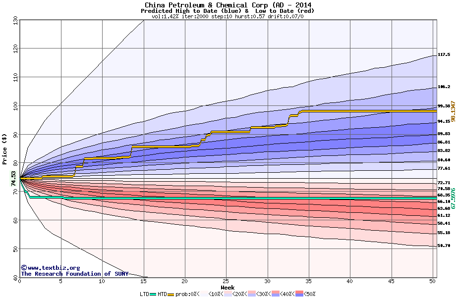 The high to date and low to date prices of the stock plotted against a random walk model for 2014 (what's this?).