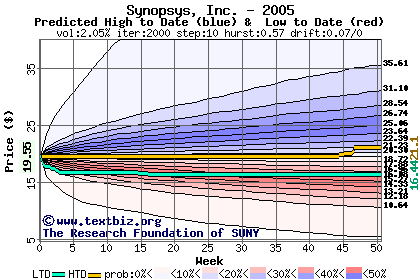 The high to date and low to date prices of the stock plotted against a random walk model for 2005 (what's this?).