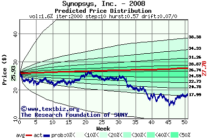 The following graph plots the year-to-date performance of the stock for 2008 compared to the probability calculated by a random walk model.