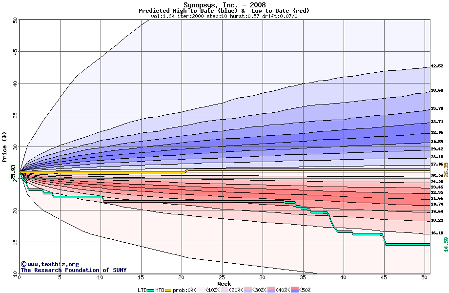 The high to date and low to date prices of the stock plotted against a random walk model for 2008 (what's this?).