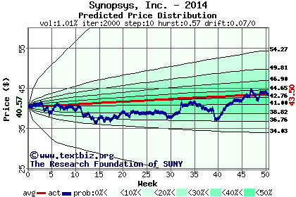 The following graph plots the year-to-date performance of the stock for 2014 compared to the probability calculated by a random walk model.