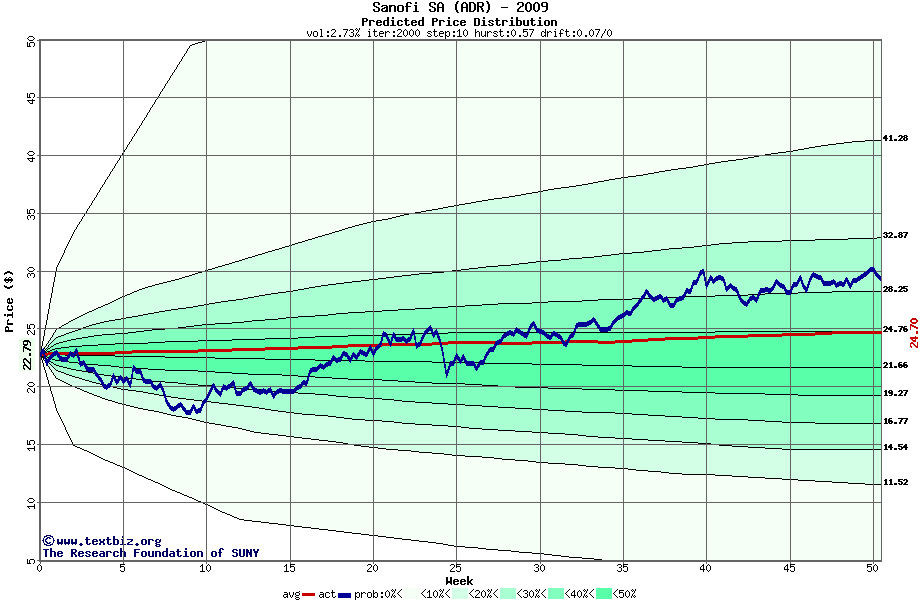 The following graph plots the year-to-date performance of the stock for 2009 compared to the probability calculated by a random walk model.