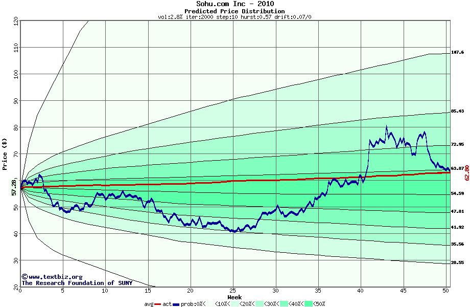 The following graph plots the year-to-date performance of the stock for 2010 compared to the probability calculated by a random walk model.