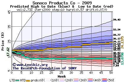 The high to date and low to date prices of the stock plotted against a random walk model for 2009 (what's this?).