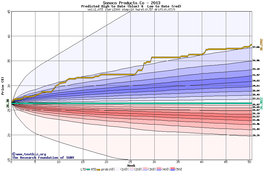 The following graph plots the year-to-date performance of the stock for 2013 compared to the probability calculated by a random walk model.