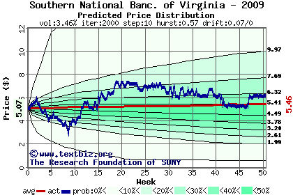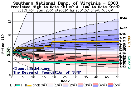 The high to date and low to date prices of the stock plotted against a random walk model for 2009 (what's this?).