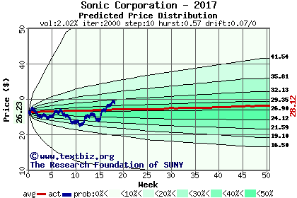 The high to date and low to date prices of the stock plotted against a random walk model for 2017 (what's this?).