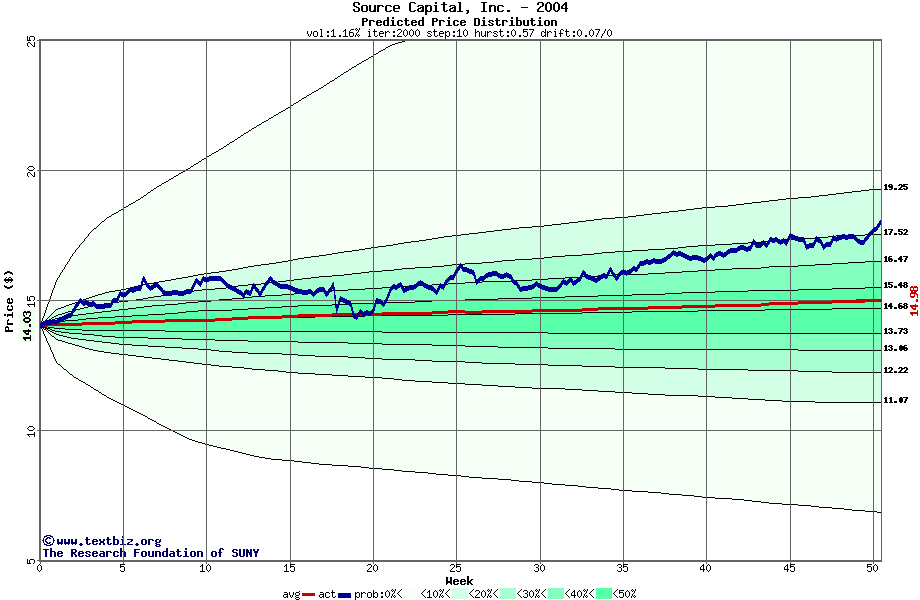 The following graph plots the year-to-date performance of the stock for 2004 compared to the probability calculated by a random walk model.