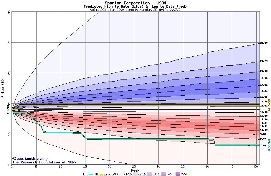 The high to date and low to date prices of the stock plotted against a random walk model for 1984 (what's this?).