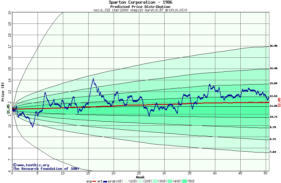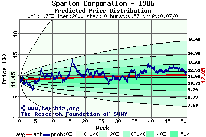 The following graph plots the year-to-date performance of the stock for 1986 compared to the probability calculated by a random walk model.