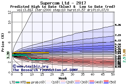 The high to date and low to date prices of the stock plotted against a random walk model for 2017 (what's this?).