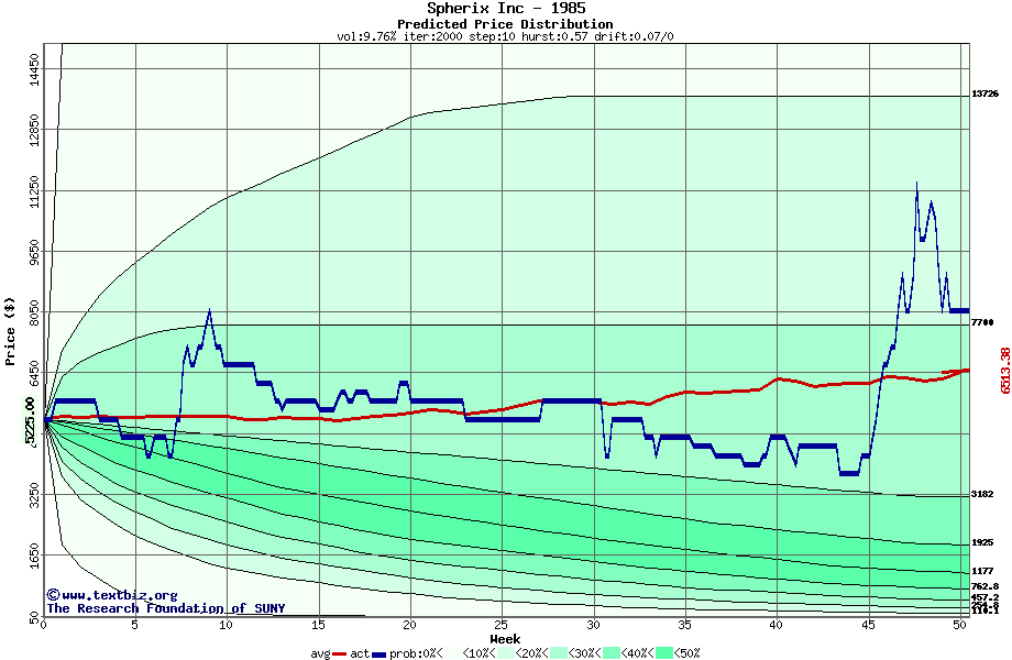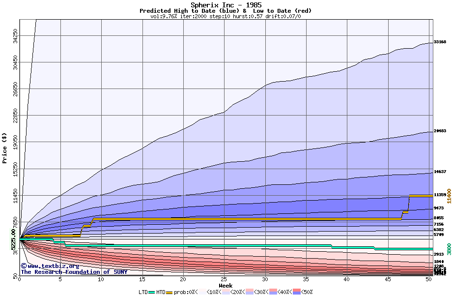 The following graph plots the year-to-date performance of the stock for 1985 compared to the probability calculated by a random walk model.